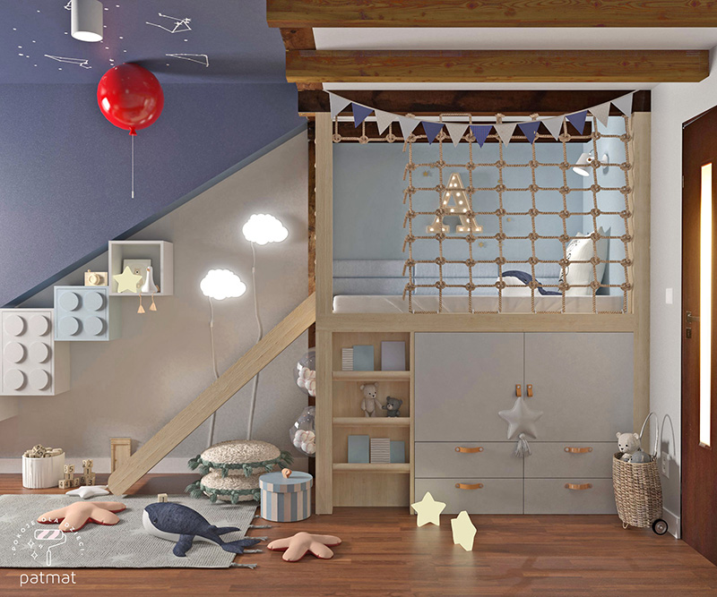 Tutaj łóżko znajduje się na antresoli a pod nią pojemne szafki na ubrania. Antresola zabezpieczona jest siatką z liny jutowej. Wejście na łóżko po drabince, która jest jednocześnie płytką półką na książeczki. Z boku antresoli zjeżdżalnia ze sklejki. Pod skosem powieszone szafki z kształcie lego.