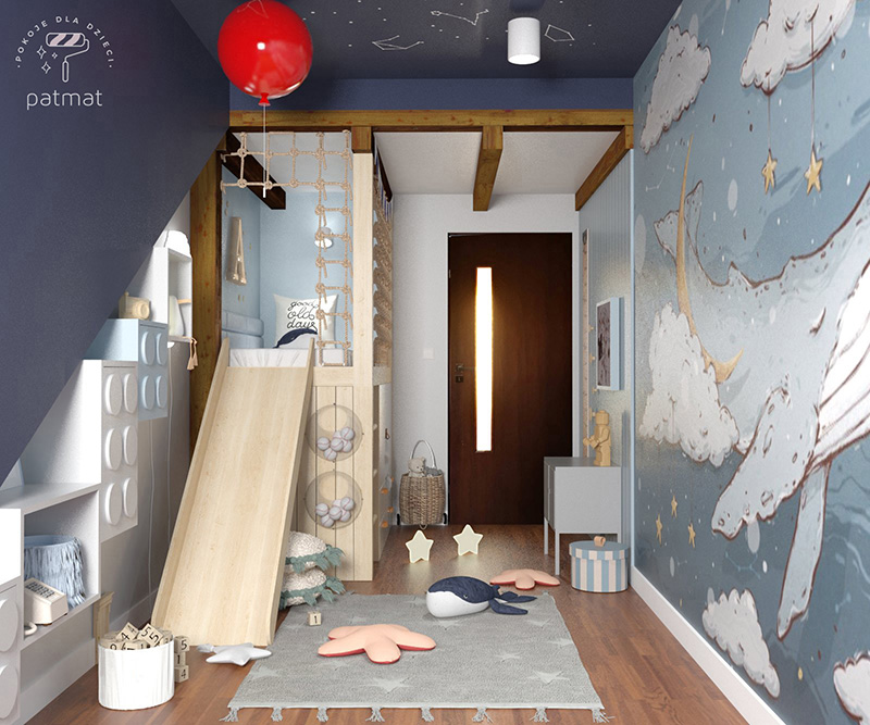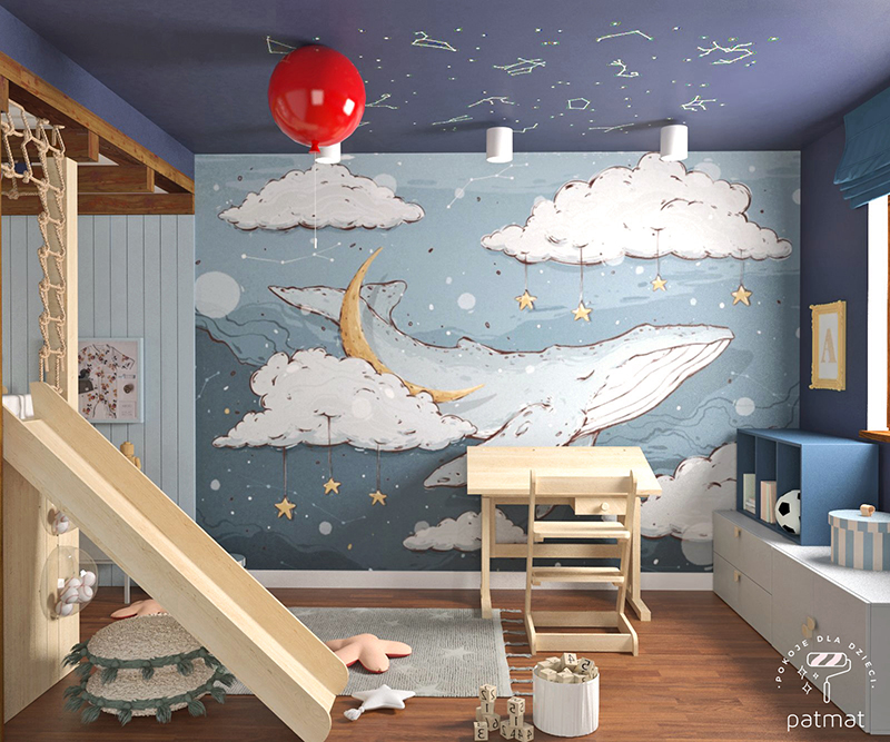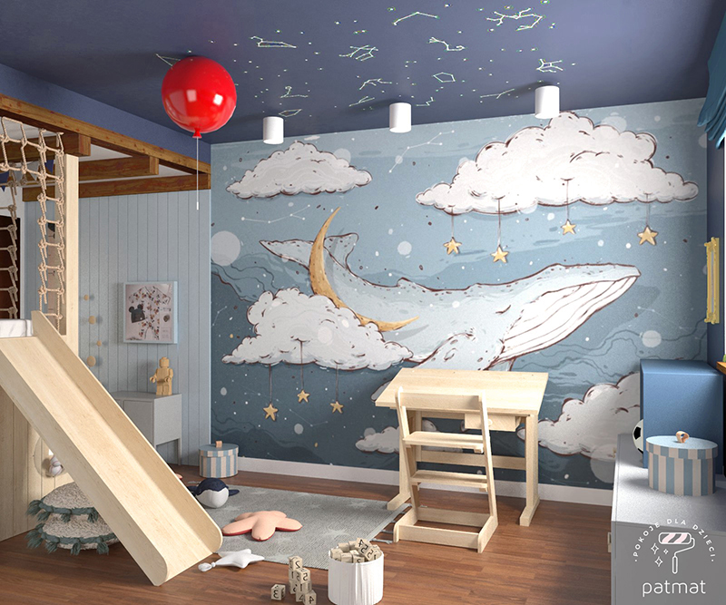 Podwodny projekt pokoju dla trzyletniego chłopca. Na ścianie tapeta z wielorybem a na suficie granatowe niebo z konstelacją gwiazd.